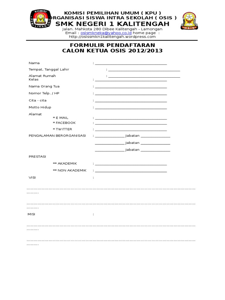 Visi Misi Mpk Aspirasi Motto Pengurus Tujuan Osis from passinggrade.co.id Pilih saya sebagai ketua osis dengan no. Komitmen kami bekerja sepenuh hati. Mengajak siswa siswi untuk mentaati tata tertib sekolah dan program kerja yang kami buat. Calon ketua osis tp 2015/2016. Visi saya apabila menjadi ketua osis adalah motto saya adalah: Setelah mengetahui berbagai motivasi ikut osis, tidak ada salahnya kita memiliki keinginan yang lebih besar dari hanya sekedar pengurus biasa. Demikian surat ijin ini kami buat semoga dapat menjadi maklum, atas. Documents similar to formulir pendaftaran ketua osis.